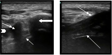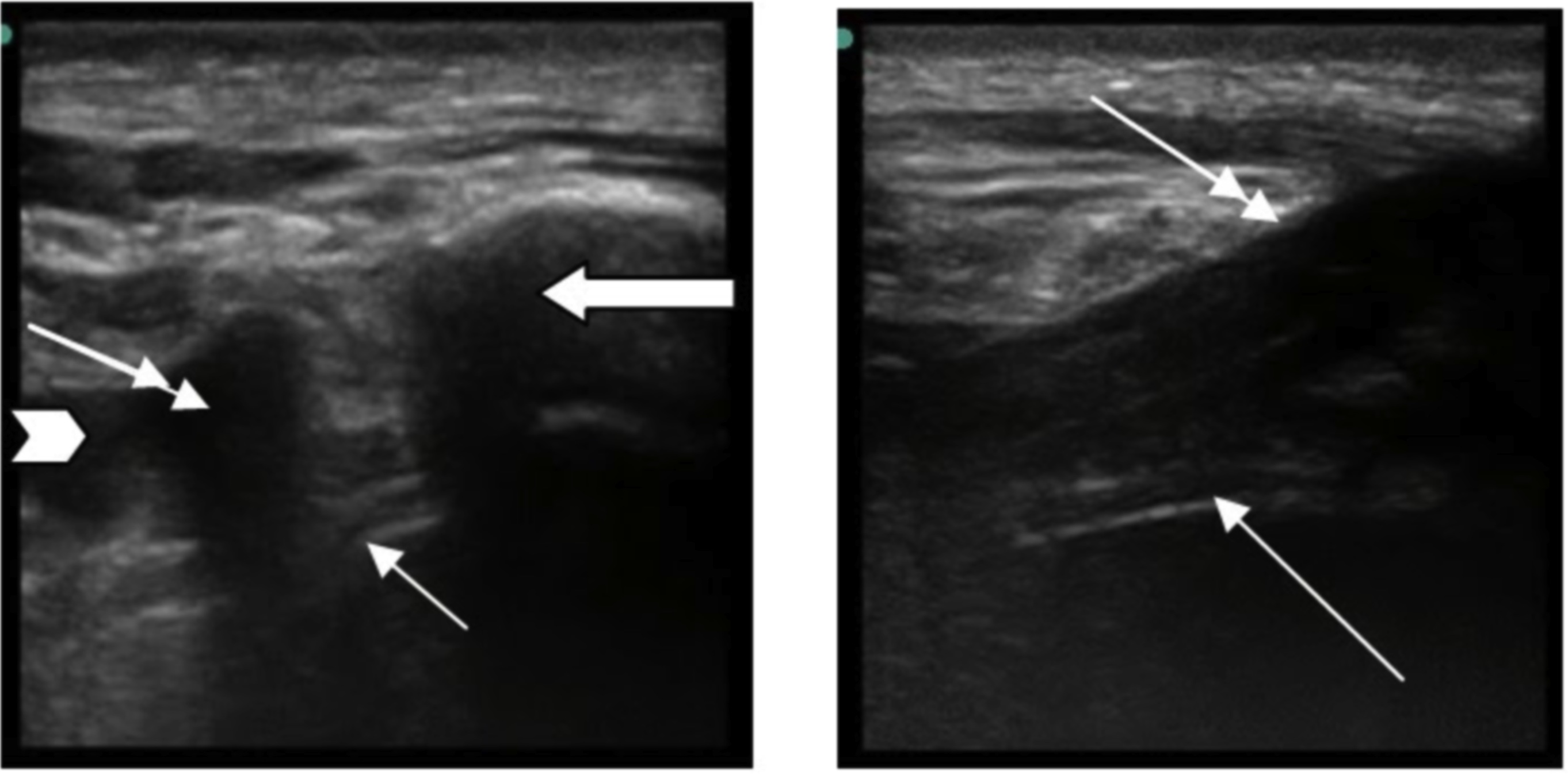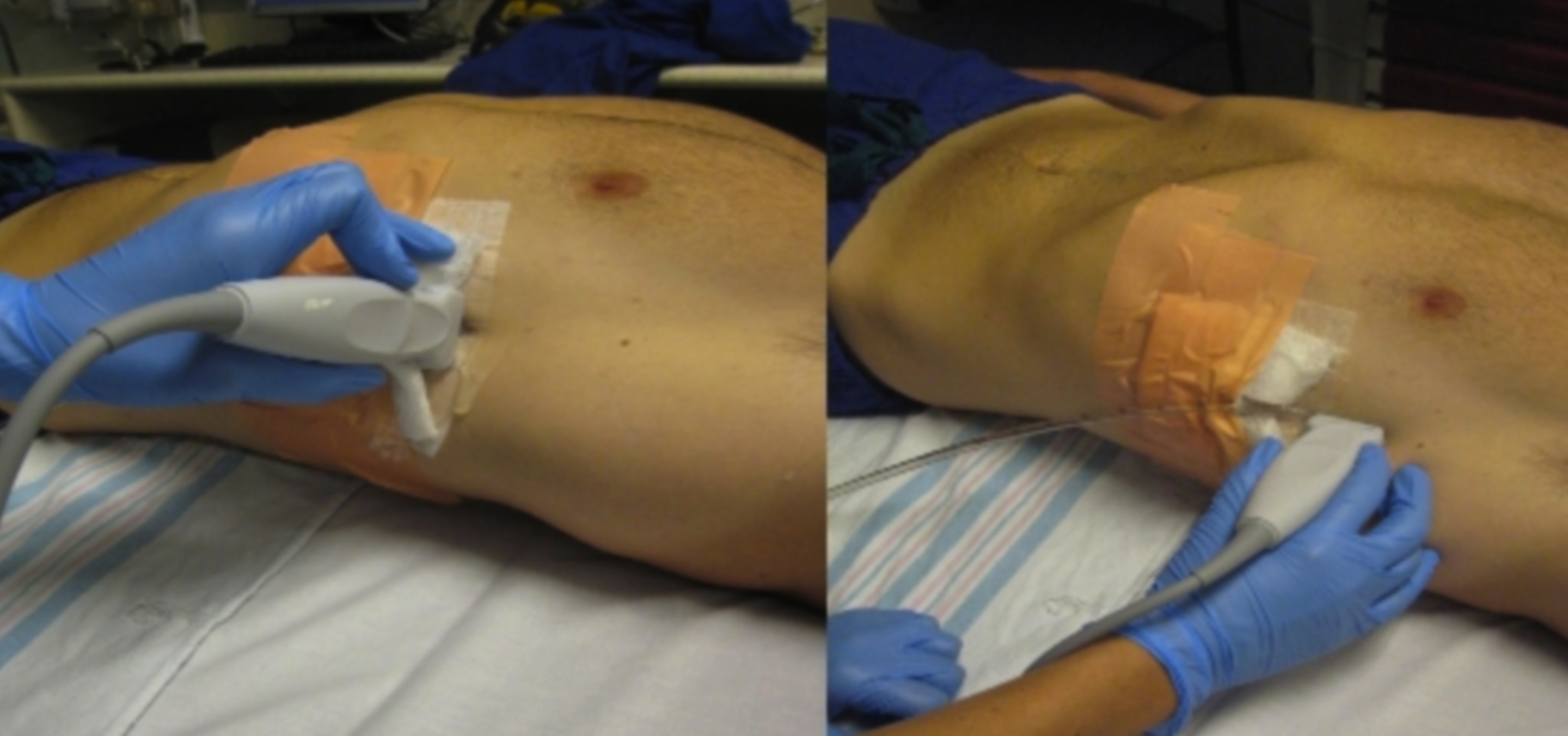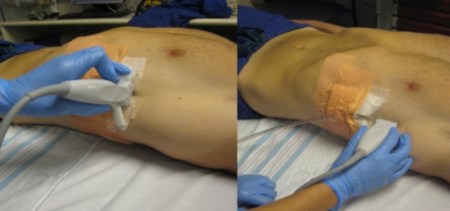 So, there are some parts of the chest missing (namely, the lower portion and costophrenic angles) on this not-so-great picture from my iPhone, but the trauma team and I did not appreciate a pneumothorax on this image. And, it just goes to show those darn studies were right, US is more sensitive than a CXR. The patient went to CT and the OR got ready for his tib/fib, but my astute resident said that we should place a chest tube prior to the intubation as this could go bad and get worse (hello tension!) after intubation – and that would be just poor form – so, our trauma colleagues agreed and in went the chest tube after return from CT, The tube, by the way, I also confirmed by US guidance for its intrathoracic placement (of course, this is a new thing and a CXR also confirmed it): the tube (double arrow) seen as the hyperechoic walled (bright) structure with shadow posteriorly next to the larger rib in the transverse view (image on your left) and you can see it enter the pleural cavity in the longitudinal view (image on your right): The landmark picture was not the actual victim, just a very nice medical student who allowed us to place the tough tape for the picture. Gotta love them! Pretty cool stuff, I tell ya!!
