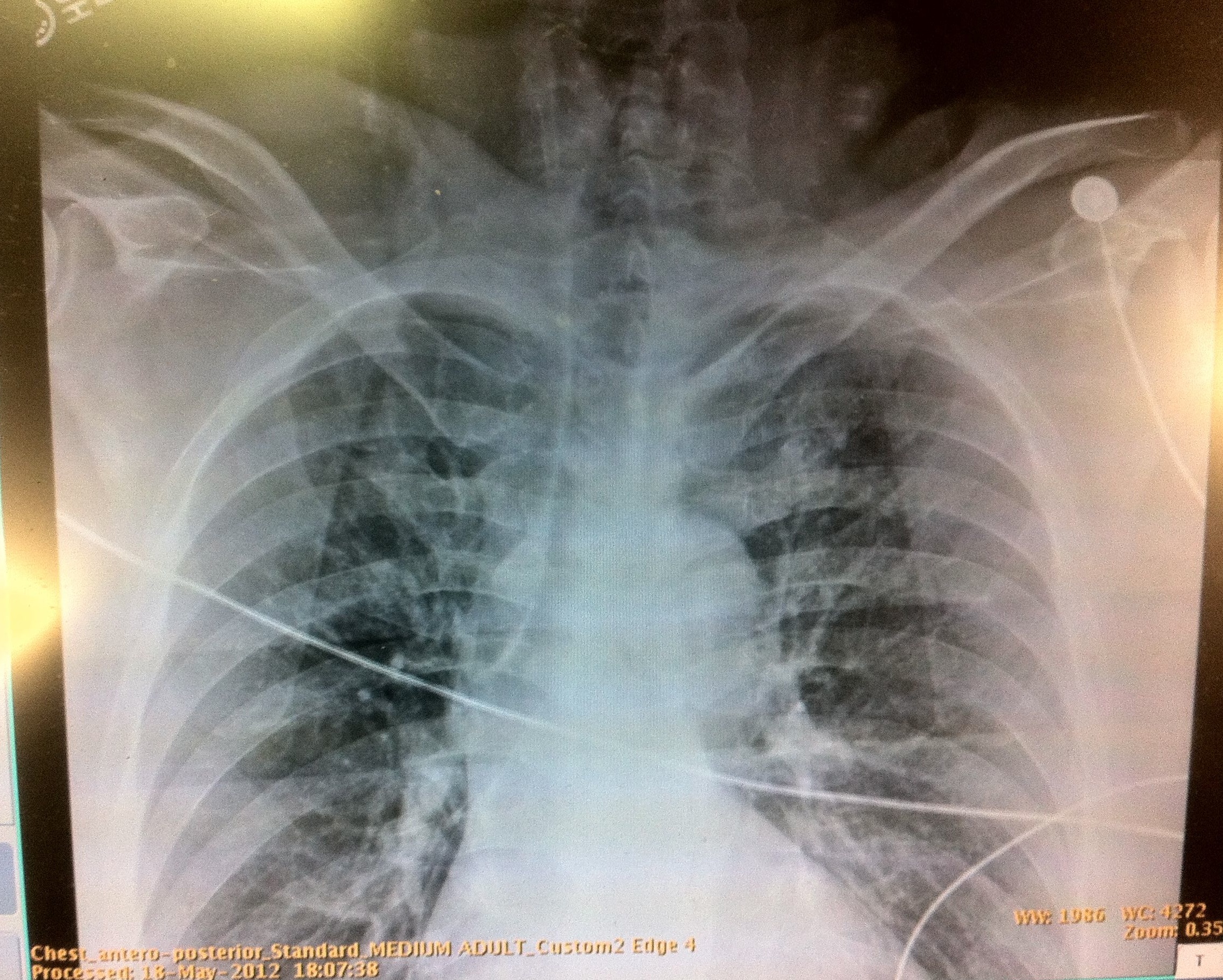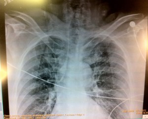The rest of his FAST scan was negative, and we knew right then and there – left sided PNEUMOTHORAX!!!! We ordered for supplemental oxygen, and, of course, had a bedside Chest XRay done to complete the trauma evaluation: