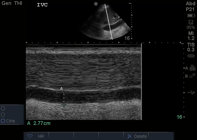 Using M Mode to measure the diameter of the IVC at the area of the hepatic vein inlet (approximately 2-3 cm from the right atria) and seeing that its over 2.5cm with no respiratory variation is like icing on the cake with what we know so far. They stopped the normal saline bolus, and considered pressor support with nitroglycerin/lasix bolus.