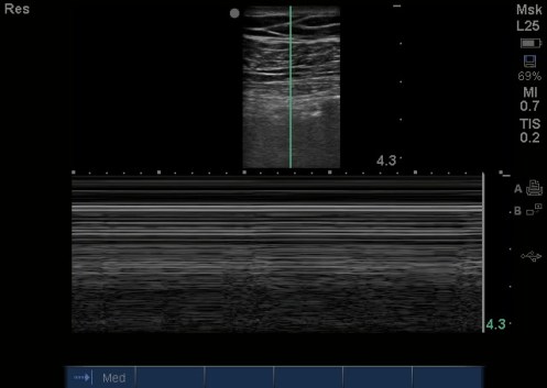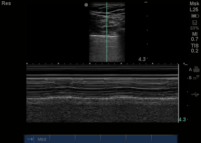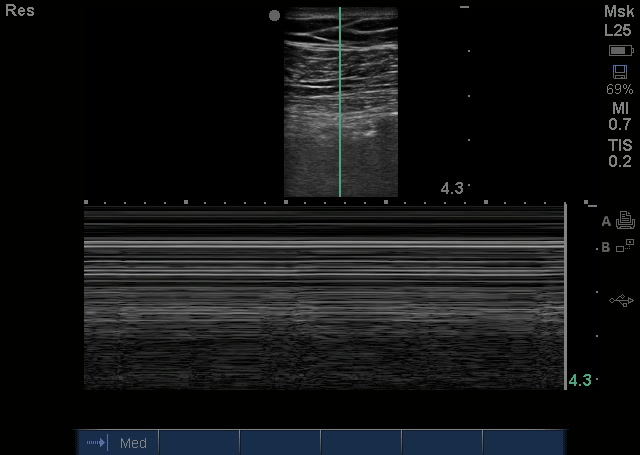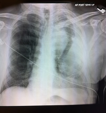 That left side had no lung sliding and a stratosphere sign on M Mode, that’s the first thing that Dr. Chough appreciated, but it was also unclear as to why it was so echogenic (gray) beneath the pleural line. He had no signs of tension pneumothorax on clinical exam, so instead of performing a needle thoracostomy and chest tube, she aborted the rest of the RUSH and ordered a stat Chest XR: