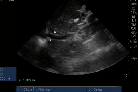 So, we see that there is no pericardial effusion/tamponade or severe RV dilation and strain to suggest pulmonary embolism, and good contractility to rule out significant MI, but there is free intraperitoneal fluid surrounding the liver – could this be due to his cancer, trauma, a ruptured aorta, or third spacing?