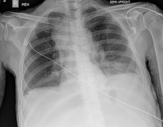 … you see blunting of the costophrenic angles and old right rib fractures, but no true focal infiltrates – interpreted by radiology as unchanged from his prior CXR except for the rib fractures (which is interesting as it suggests a trauma occurred between the prior CXR and this one). Didn’t change the thought of the providers though, they know what they saw and knew that ultrasound is better than chest radiograph for pneumonia. He responded to fluids very well and felt markedly better within a few hours, transferred to a nasal cannula, and became more responsive with stabilization of his vitals. As an inpatient, his pneumonia on his chest XRay became more apparent the next day, he continued to improve and do well, but with a CT showing extension of his cancer.