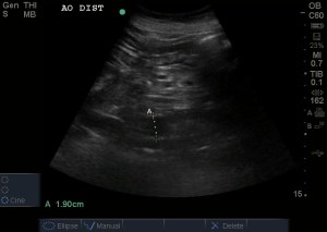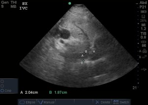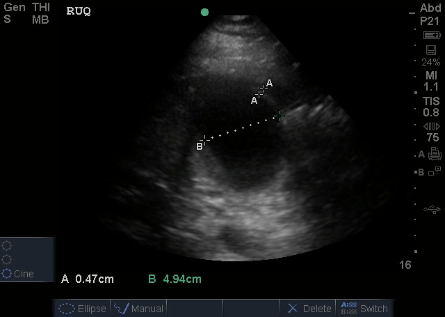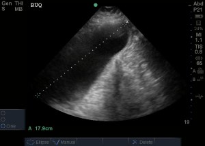 The normal gallbladder measurements are an anterior gallbladder wall of 3mm, a width of 4cm and a length of no more than 9-10cm. The common bole duct (not measured) should be 6mm at the age of 60yrs (adding a mm for every decade above 60). The above image also shows a small amount of sludge but no obvious gallstone (it may have went into the bile duct and obstructed there). So, putting it together – this is obviously abnormal and evidence of acute cholecystitis.