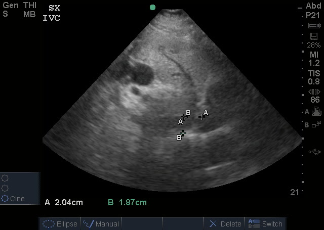 IVC is slightly on the low/normal – (normal measurement being 1.5-2.5 cm with no more than 50% respiratory variation). Not seen is the complete collapse that occurred with sniff.