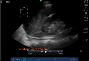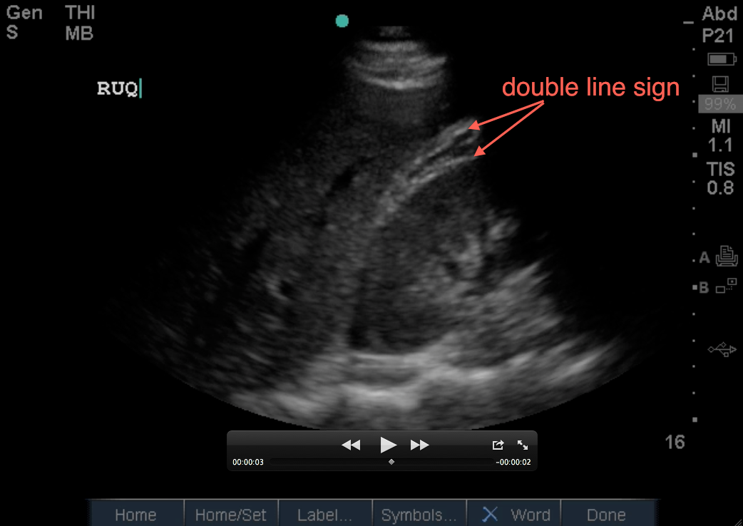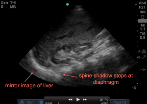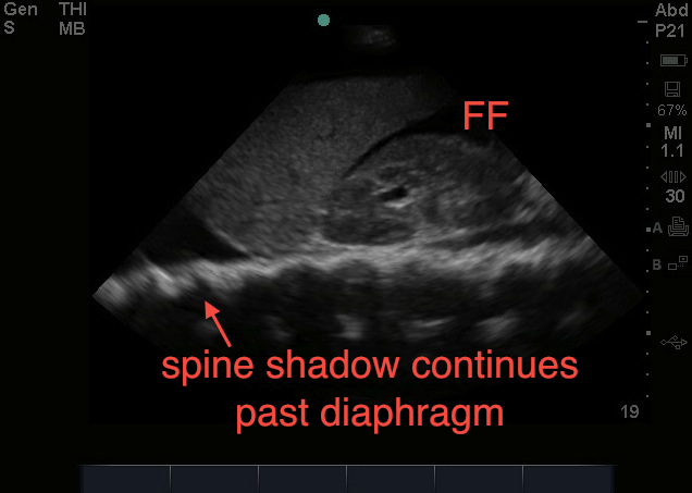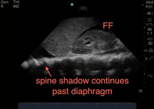 1. Evaluate above the diaphragm…. to evaluate for intrathoracic free fluid. This may involve having to increase your depth while you slowly fan your probe anterior to posterior. The patient’s breathing will also help you as you will notice the bright white (echogenic) linear diaphragm which hugs the liver will move (right and left) on your screen with every breath. Having the patient take a deep breath and holding it, will allow you better visualization if a rib shadow is in your way. A mirror image of the liver should be seen above the diaphragm (a normal artifact that occurs when ultrasound passes through structures of varying densities and then through air (lung). If no mirror image, and the area above the diaphragm is anechoic (black) – that’s fluid in the thoracic cavity! The spine sign will also help you evaluate for free intra-thoracic fluid, as the spine and it’s shadowing normally stops once it hits the diaphragm when visualizing on the screen from right to left (air is the enemy of ultrasound!). But if there is fluid in the thoracic cavity, you will see the spine continue to traverse past the diaphragm up into the thoracic area (fluid is the lover of ultrasound!).