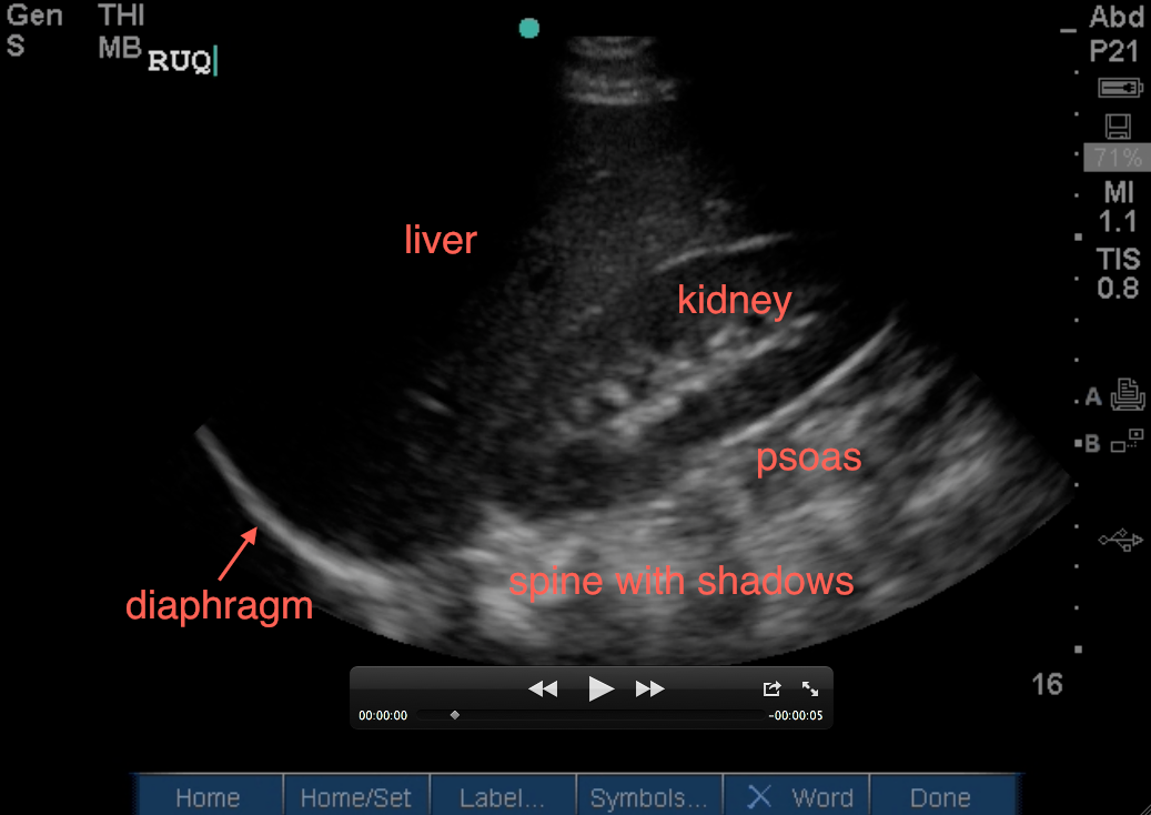 Assess that your probe is in the correct location by seeing (from top of screen to bottom): the liver on your screen and slowly angling it posteriorly to get the kidney also on your screen which is right above the psoas and then spine (with it’s shadow). If you do not see the liver, you may be too high or too low – slide down or up a rib space to get yourself oriented to the correct region with the depth usually being at 16cm.