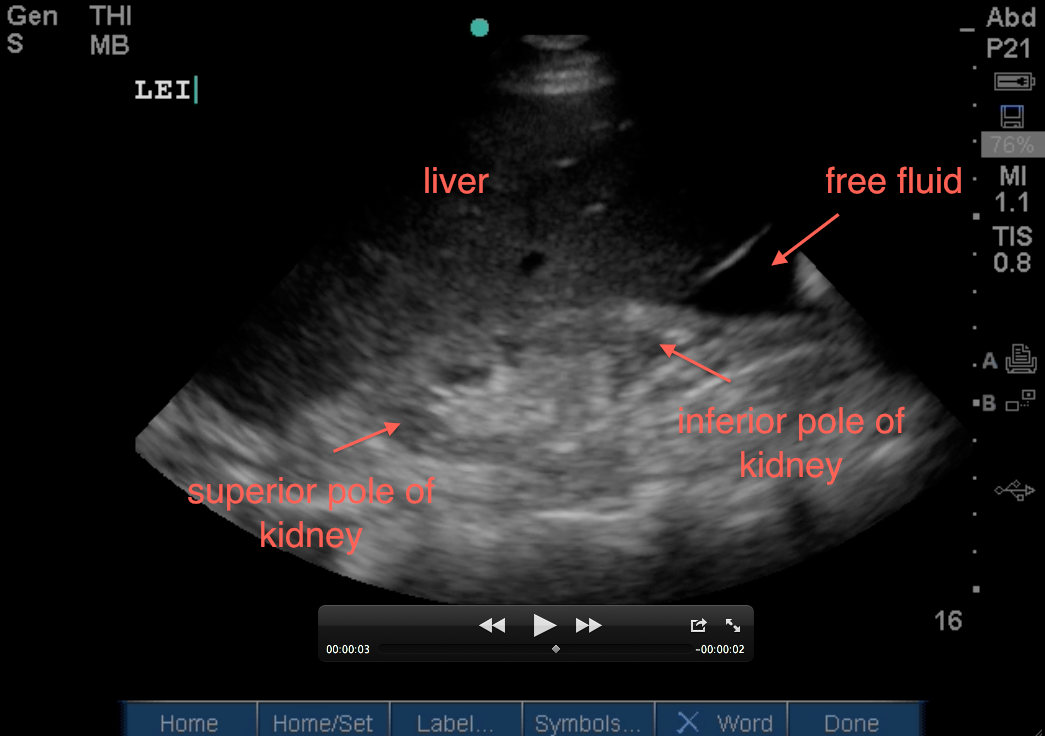 3. Evaluate between the liver and the entire superior pole of the kidney (classic Morrison’s pouch view). Slowly fan anterior to posterior to visualize the entire superior pole of kidney – you should fan to the extent that the kidney goes completely out of view, comes back into view, then goes back out of view.
