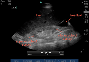 4. Evaluate between the left edge of the liver and the entire inferior pole of the kidney. This will also evaluate the right paracolic gutter. I was saving the best for last here. This image is key in not missing free intraperitoneal free fluid as this is where free fluid will be seen first in the right upper quadrant and with more accuracy than any other part of the right upper quadrant view.