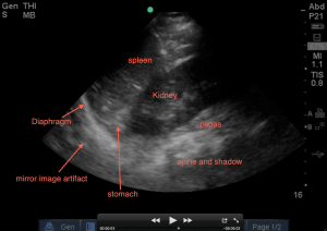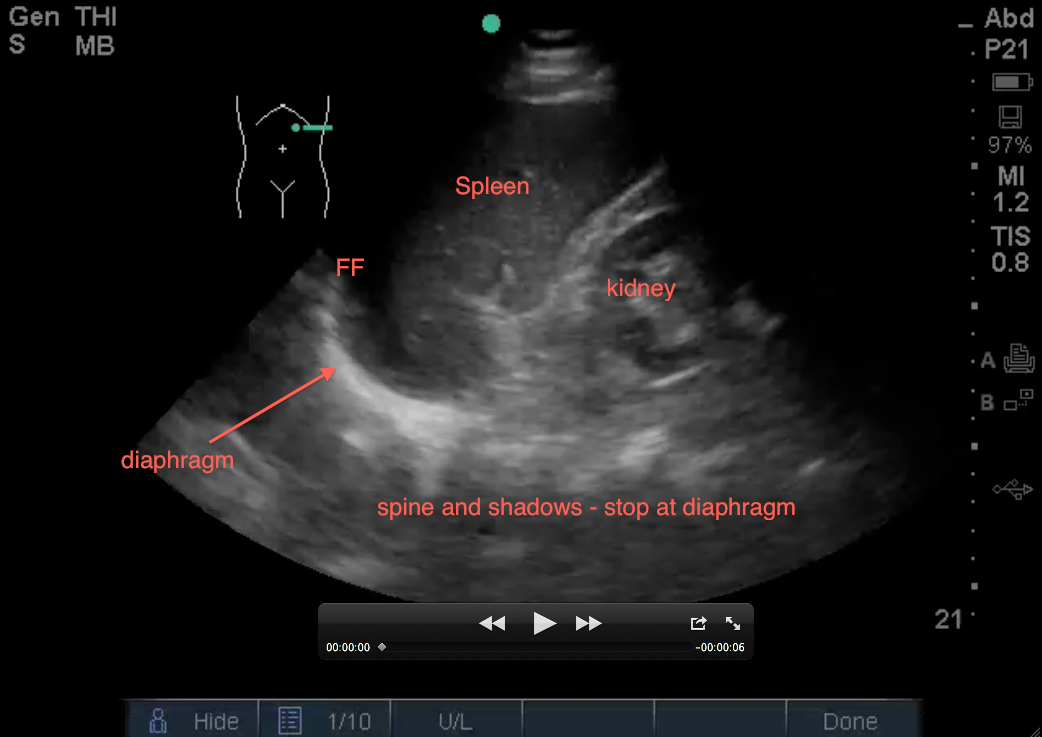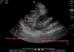 1. Evaluate above the diaphragm…. to evaluate for intrathoracic free fluid. This may involve having to increase your depth while you slowly fan your probe anterior to posterior (from 13cm to 16cm – you dont usually need to go 19cm unless it’s a huge spleen). The patient’s breathing will also help you as you will notice the bright white (echogenic) linear diaphragm which hugs the spleen will move (right and left) on your screen with every breath. Having the patient take a deep breath and holding it, will allow you better visualization if a rib shadow is in your way. A mirror image of the spleen may be seen above the diaphragm (a normal artifact that occurs when ultrasound passes through structures of varying densities and then through air (lung). However, in the LUQ, If no mirror image, it may not mean free fluid, especially if the stomach is in your view. If the area above the diaphragm is truly anechoic (black) without Stomach Sabotage – that’s fluid in the thoracic cavity! The spine sign will also help you evaluate for free intra-thoracic fluid, as the spine and it’s shadowing normally stops once it hits the diaphragm when visualizing on the screen from right to left (air is the enemy of ultrasound!). But if there is fluid in the thoracic cavity, you will see the spine continue to traverse past the diaphragm up into the thoracic area (fluid is the lover of ultrasound!).