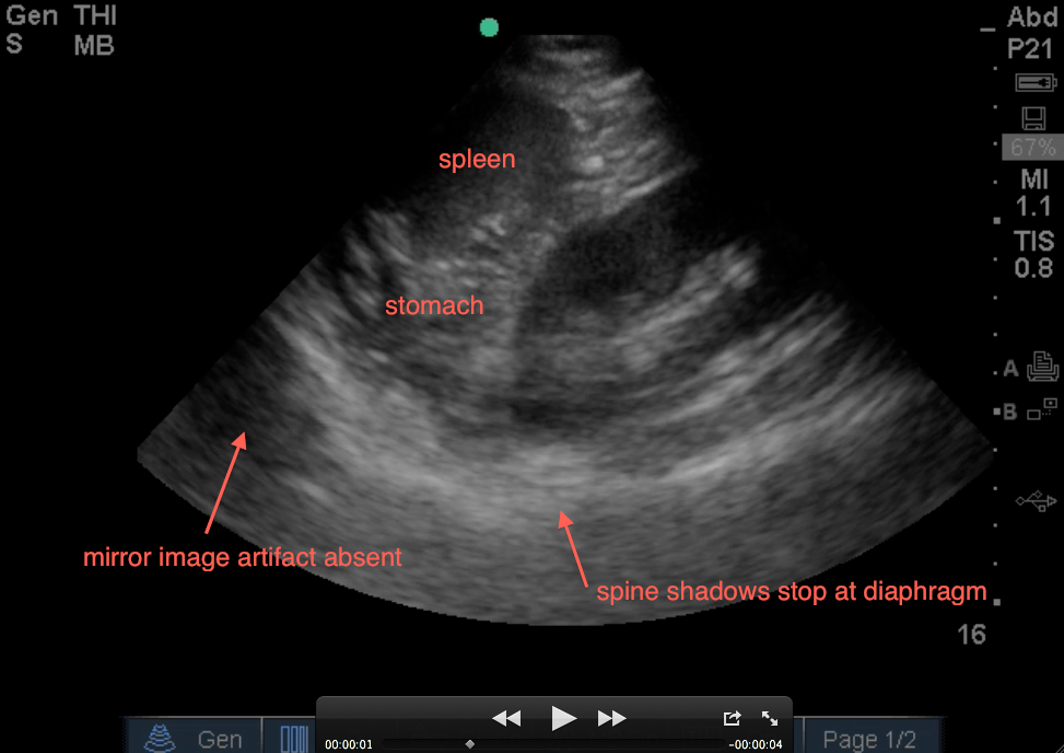Sometimes the stomach is so large that it can monopolize the entire screen (even be mistaken for intrathoracic free fluid). This is particularly true if your probe is at the anterior axillary line, the patient is being bagged before coming to the ED room, or after the patient had a very large and likely yummy meal: