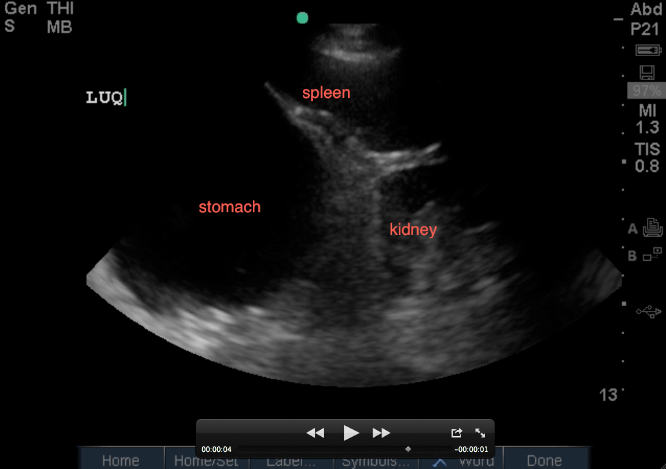 3. Evaluate between the spleen and the entire superior pole of the kidney. Slowly fan anterior to posterior to visualize the entire superior pole of kidney – you should fan to the extent that the kidney goes completely out of view, comes back into view, then goes back out of view. This area will have free fluid in addition to the other regions of the LUQ. It’s the last area for free fluid to collect.