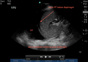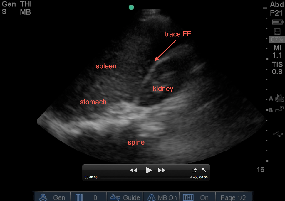 In the below video, you can see that by slowly fanning from anterior to posterior, getting the stomach out of your way, free fluid above and below the diaphragm becomes evident: