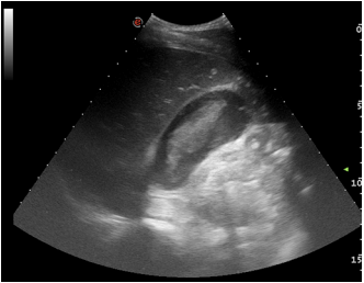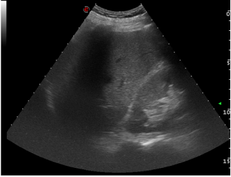 This pericholecystic fluid collection rapidly increased in size on serial FAST examination after 5 min.