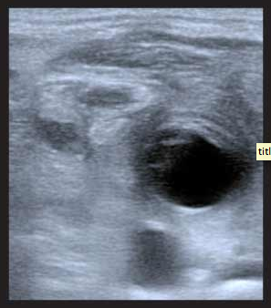 In this month’s issue of EP Monthly, they describe a case of a 50 year old with a history of diabetes and heroin use on home IV antibiotics for tarsal osteomyelitis with gradual onset fo left sided neck pain without fever or difficulty swallowing, or sore throat. She has pain with movement of her neck and her oropharynx is clear. Hmmmm, so the diagnosis is not presenting itself and whenever that happens to me, I gra the ultrasound machine to see if it can provide more information – just as they did. They get the below image with compression of his left neck with the linear probe: