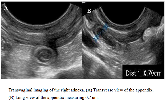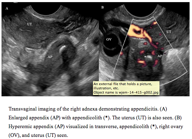 Ok, back to the case reports in WestJEM by Bramante et al. The 2 cases showed the evaluation and pretty obvious sonographic images seen with acute appendicitis with transvaginal ultrasound after an equivocal transabdominal ultrasound: