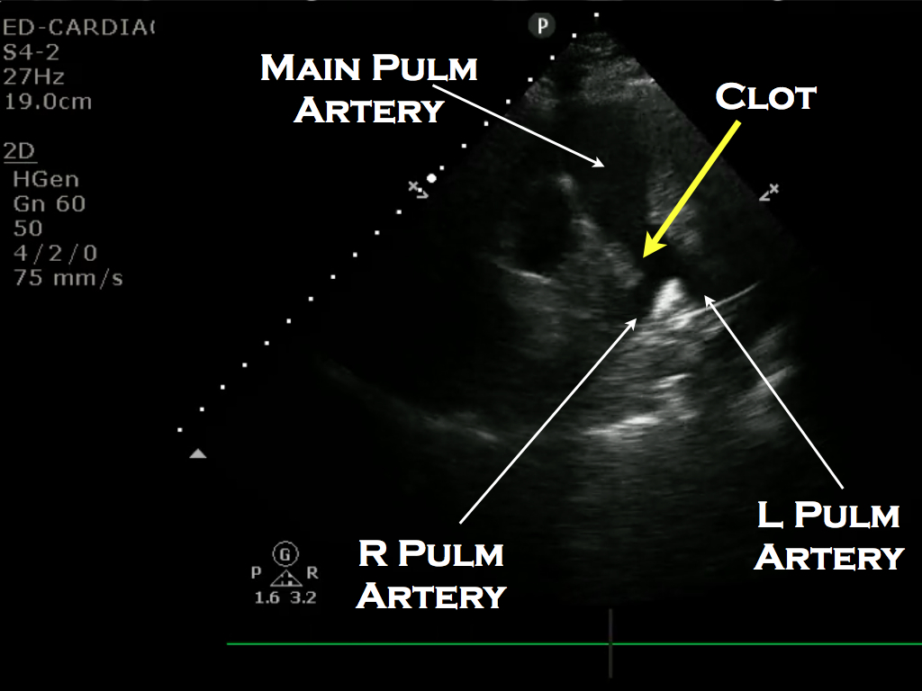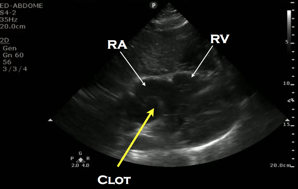 Another, less commonly seen finding would be directly seeing the clot in the right atrium (RA) or in the pulmonary arteries.