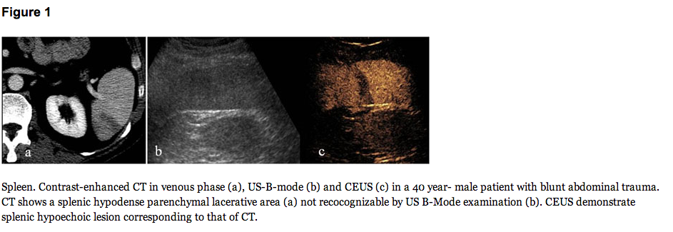 In a recent article in Critical Ultrasound Journal from July 2013, the authors (Italians, of course! – they always do things ahead of everyone!) discuss the utility of contrast enhancement for solid organ evaluation in trauma patients. So, the FAST scan will assess for free fluid from injury, but we dont know what that injury is through a simple FASt scan. With contrast, we can better visualize the solid organs and assess for injury. The authors say it best, “Computed Tomography (CT) is the standard reference in the emergency for evaluating the patients with abdominal trauma. Ultrasonography (US) has a high sensitivity in detecting free fluid in the peritoneum, but it does not show as much sensitivity for traumatic parenchymal lesions. The use of Contrast-Enhanced Ultrasound (CEUS) improves the accuracy of the method in the diagnosis and assessment of the extent of parenchymal lesions. Although the CEUS is not feasible as a method of first level in the diagnosis and management of the polytrauma patient, it can be used in the follow-up of traumatic injuries of abdominal parenchymal organs (liver, spleen and kidneys), especially in young people or children.”