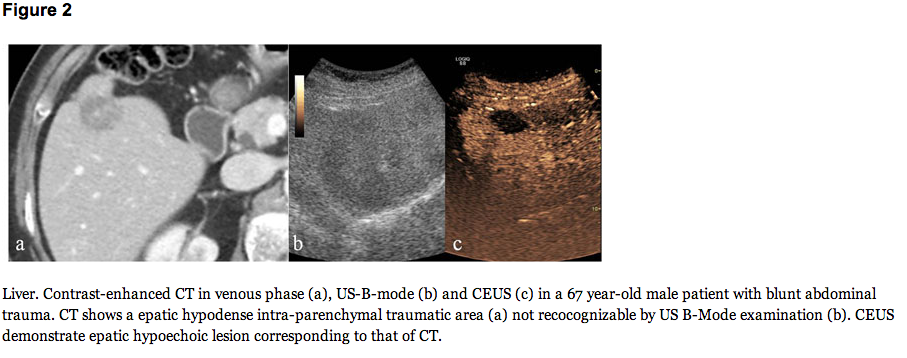 The thing to keep in mind is that this is actually not new – but evolving and getting spoken about more and more – as the authors state: “The first results in the literature indicates the use of CEUS in patients with blunt abdominal trauma after the FAST (Focused Assessment with Sonography in Trauma) or the US, in hemodynamically stable patients with a history of low-energy trauma [1,4,6]. CT is reserved in cases of severe trauma, with clinical suspicion of multiorgan lesions and cases with inconclusive CEUS [6].”